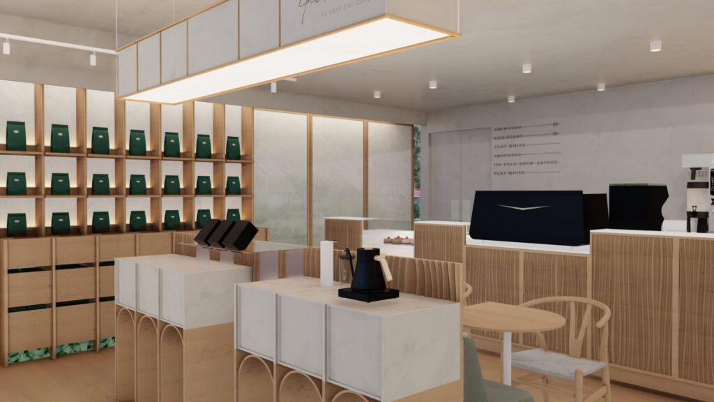 Cafetería de autor que envuelve al usuario en la cultura del café. Textiles teñidos, maderas naturales y una atmósfera sobria crean una experiencia sensorial completa.