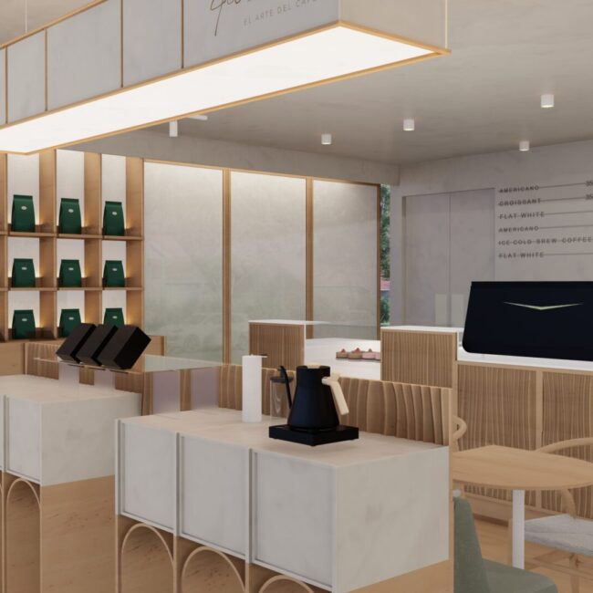 Cafetería de autor que envuelve al usuario en la cultura del café. Textiles teñidos, maderas naturales y una atmósfera sobria crean una experiencia sensorial completa.