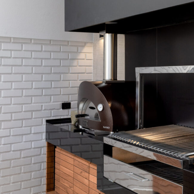 Espacio social diseñado para el encuentro. Pergolado de madera y vidrio, materiales nobles y una barra protagonista definen un ambiente funcional y sofisticado.