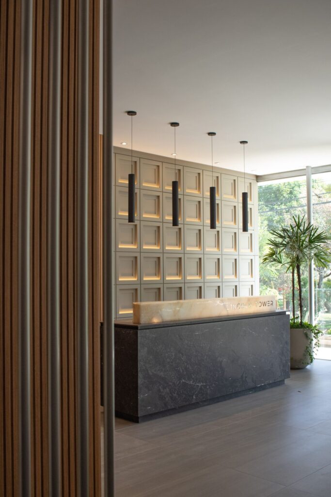 Ingreso sobrio y sofisticado que jerarquiza la experiencia de llegada. Molduras retroiluminadas, piedra y mármol translúcido dialogan con mobiliario diseñado a medida.